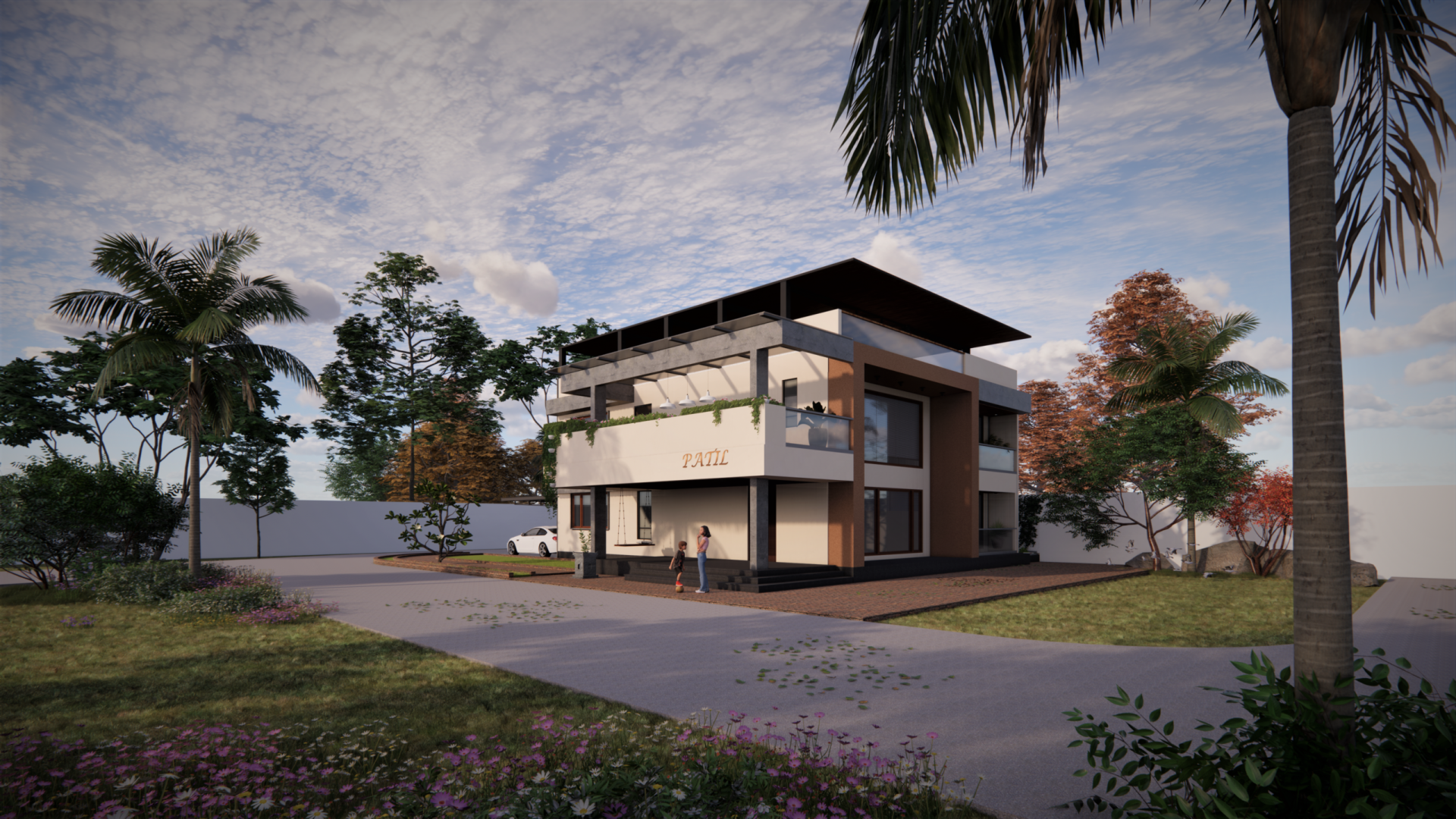 This residence is a striking example of Tropical Modernism, defined by its bold geometric massing and sophisticated interplay of solid and void. The façade features a prominent cantilevered volume on the first floor, which not only adds structural dynamism but also provides deep shading for the entrance porch below, protecting it from harsh sunlight. A refined material palette of textured plaster, natural stone cladding, and warm timber accents creates a tactile depth that contrasts beautifully with the clean lines of the structure. Vertical wooden louvers and brise-soleil screens are strategically positioned to ensure privacy and filter daylight, enhancing the building’s climate responsiveness. The upper level is crowned with a semi-open pergola, creating a breezy terrace space that connects the residents with the outdoors. Integrated planters and trailing vines soften the hard edges, seamlessly blending the architecture with the landscape.